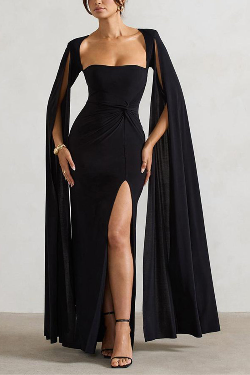 Your new evening dress showcases a striking cape design and sophisticated silhouette. Perfect for elegant events, it's designed to make a lasting impression.