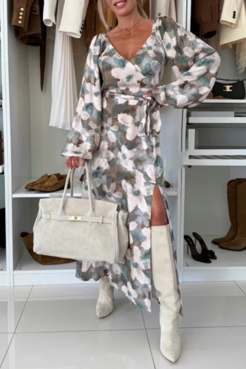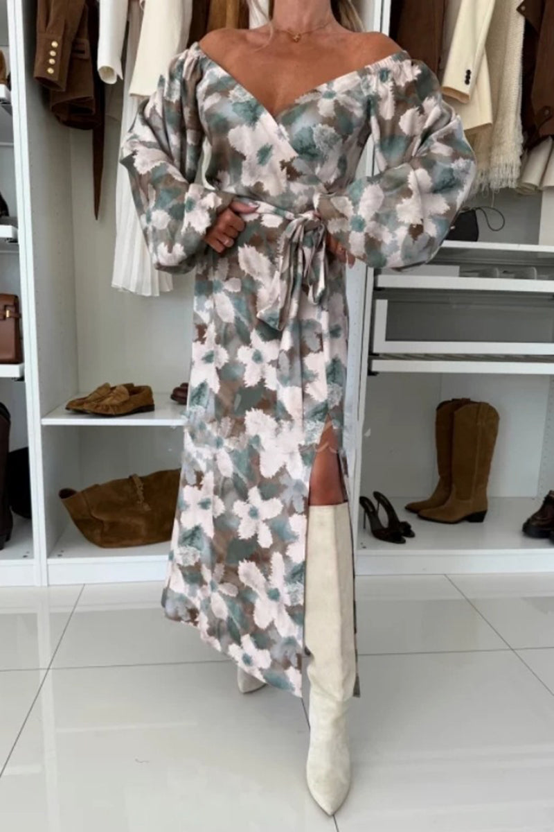 Your new floral wrap dress showcases a romantic style with an off-shoulder neckline and a side slit. It effortlessly takes you from day outings to evening gatherings with ease.