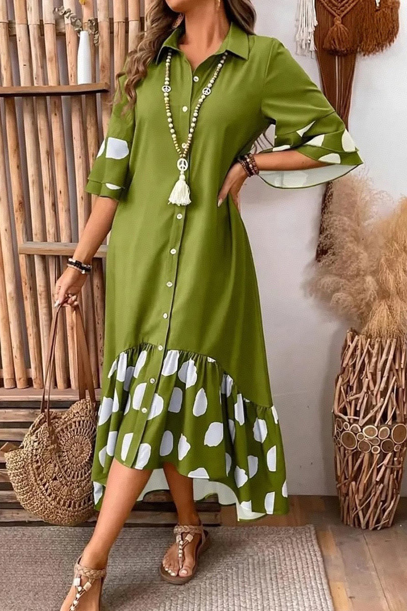 Your new relaxed midi dress showcases playful polka dots and a button-front design. Perfect for casual outings, it combines comfort with effortless style.