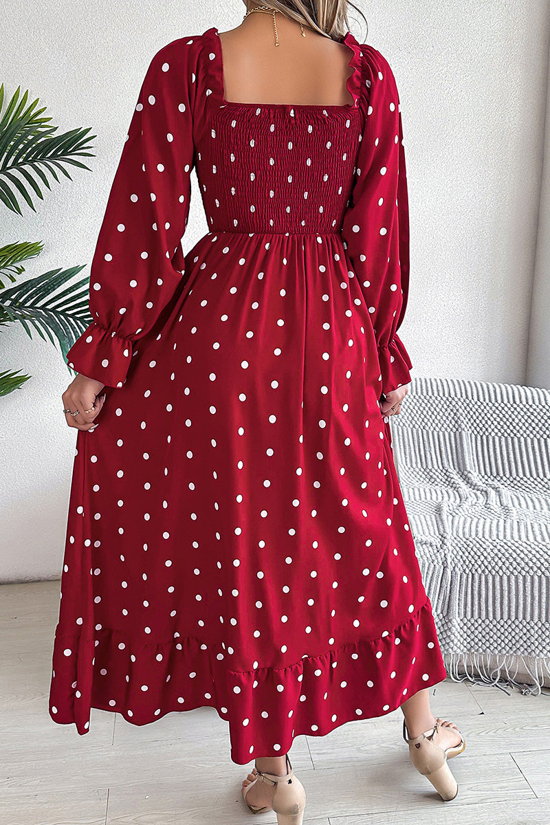 Your new favorite dress features a charming polka dot pattern and comfortable smocked bodice. Effortlessly pairs with sandals or heels, perfect for casual outings or gatherings.