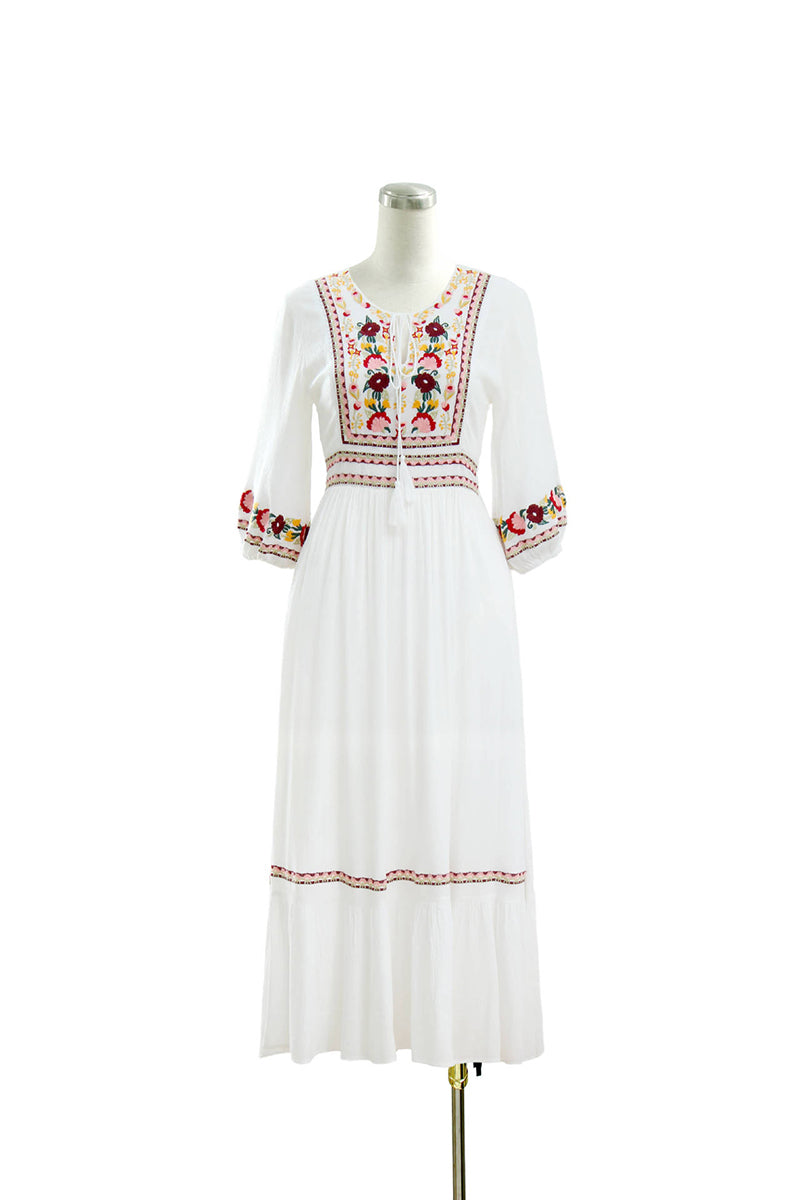 Your new boho chic dress features intricate pattern and a graceful silhouette. Perfect for casual outings, it effortlessly blends comfort with style.