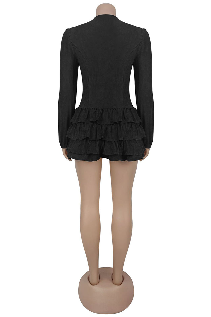 Your new mini dress features a stylish lace-up front and layered ruffle design. Perfectly suited for transforming your office look into evening chic.