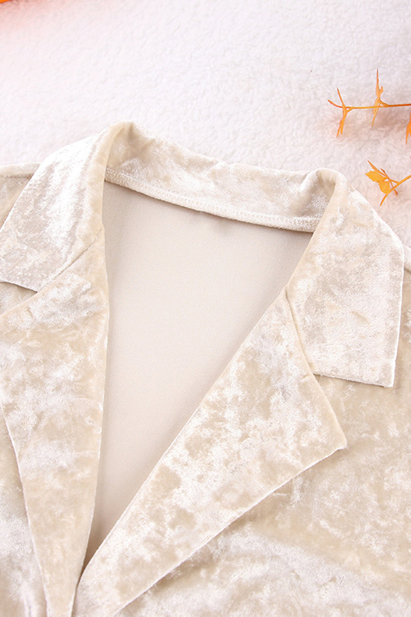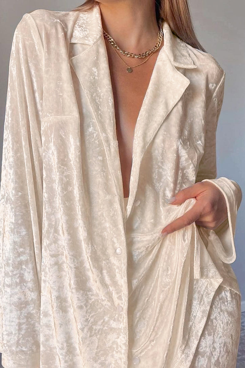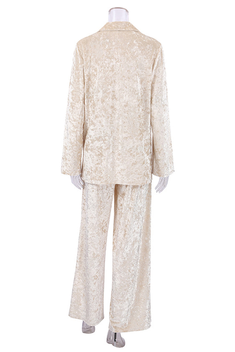 Your new sophisticated set features a relaxed jacket and wide-leg pants for comfort. Effortlessly chic, perfect for transitioning from work to dinner.