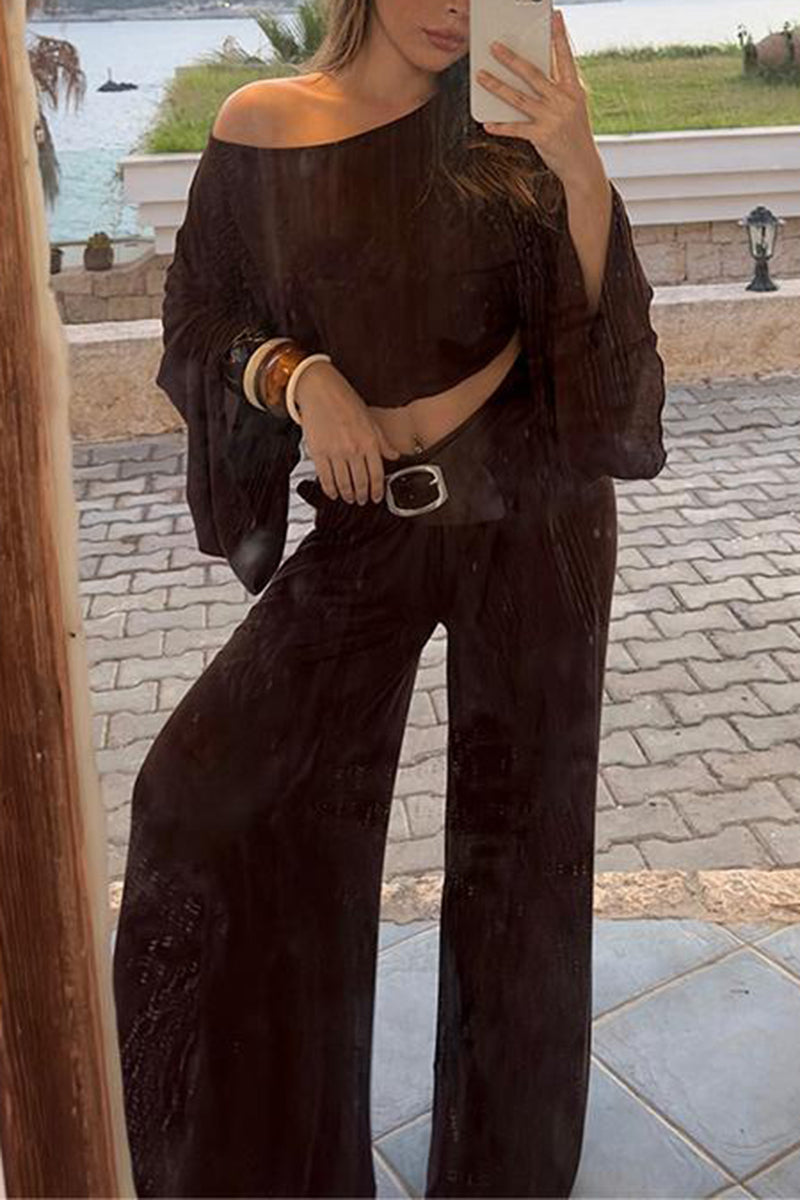 Your new versatile set showcases an off-shoulder top with an elegant wide-leg pants silhouette. Perfectly suited for both casual outings and chic evening events.