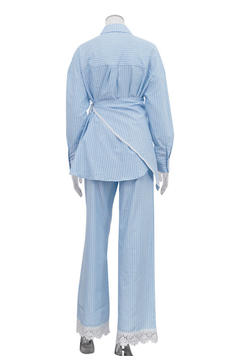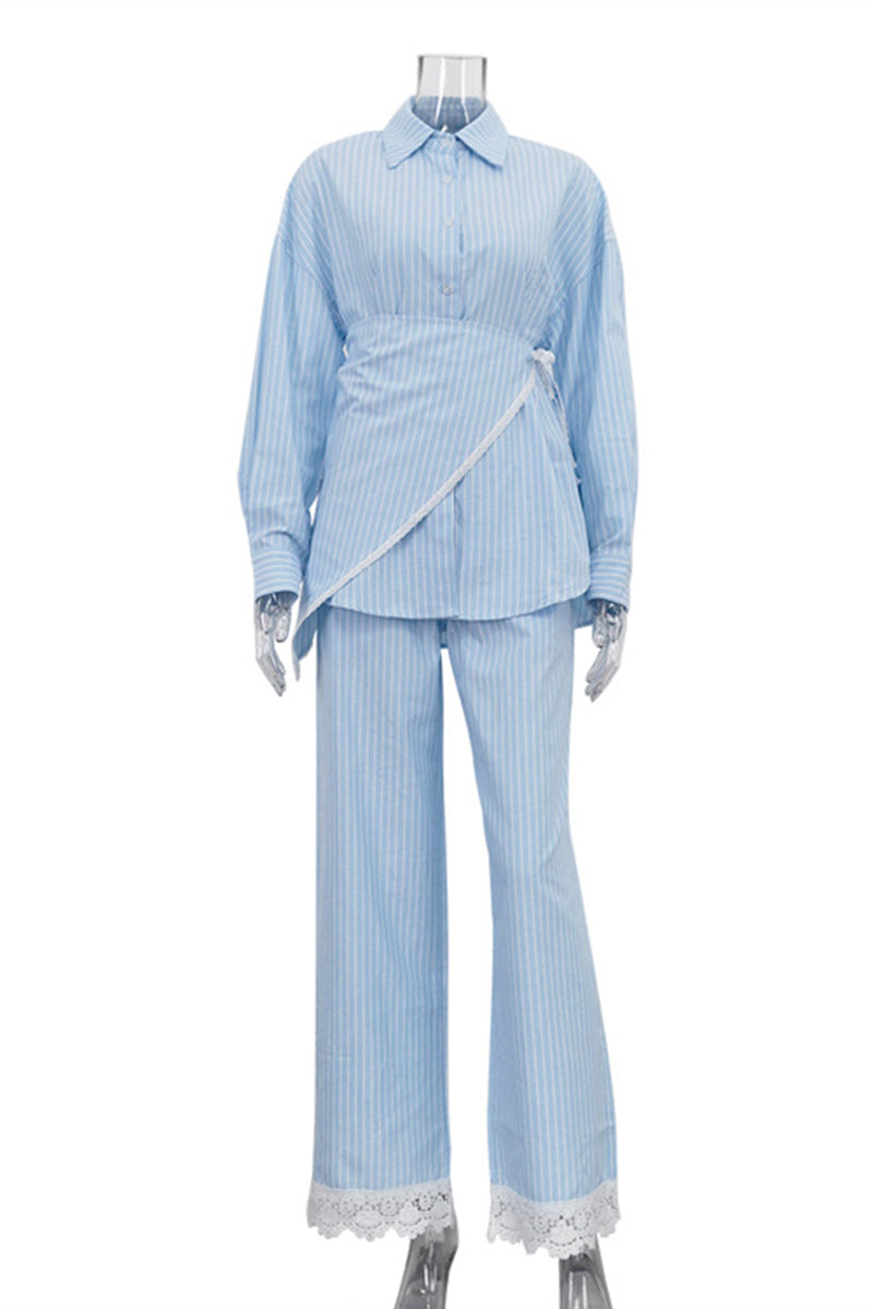 Your new pant set features a stylish striped design with elegant lace trim. Perfectly suited for both casual and formal occasions, offering versatility and charm.
