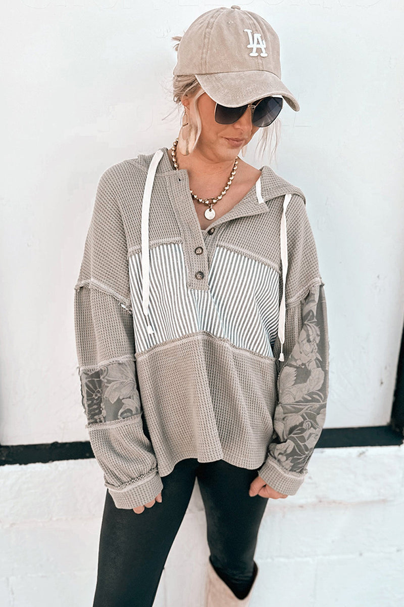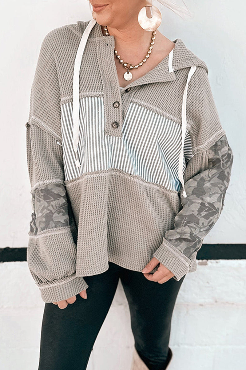 Your new casual sweatshirt features a button-front style with unique patchwork accents. Versatile and trendy, ideal for layering in any season.