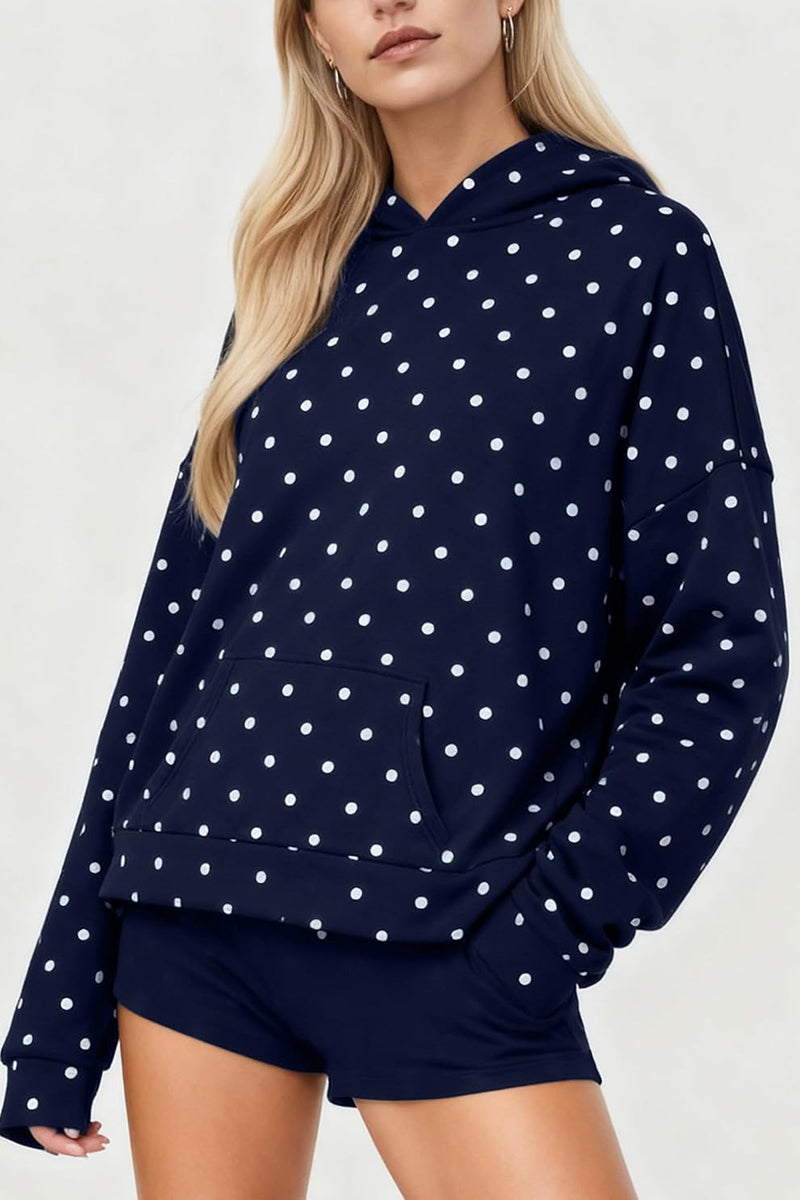 Your new favorite sweatshirt features a playful polka dot design and cozy hooded style. Perfectly suited for casual outings and relaxed weekends.
