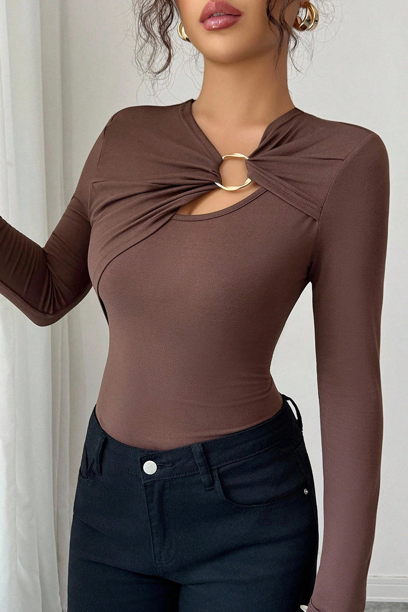 Your new chic blouse features a unique twist front with ring detail. Perfect for adding elegance to both casual and formal ensembles.