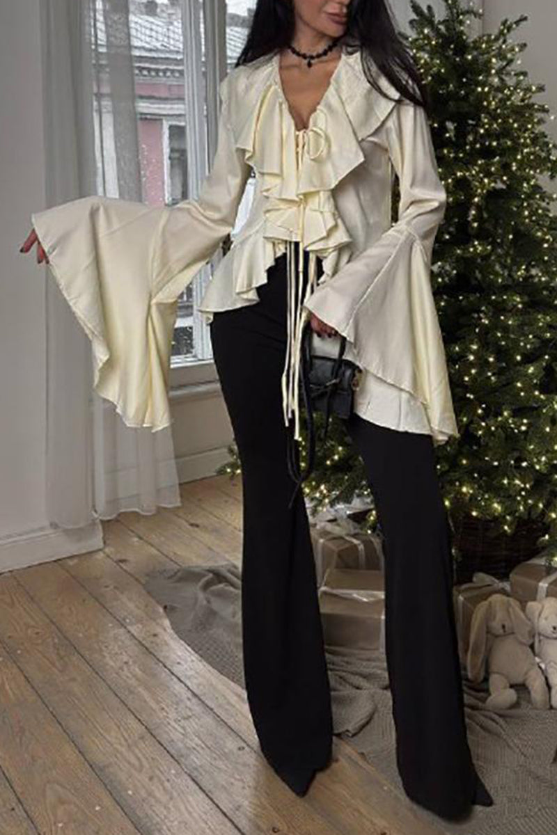 Your new standout blouse showcases dramatic ruffles and elegant bell sleeves. Elevates any outfit with its sophisticated charm, perfect for both day and evening wear.