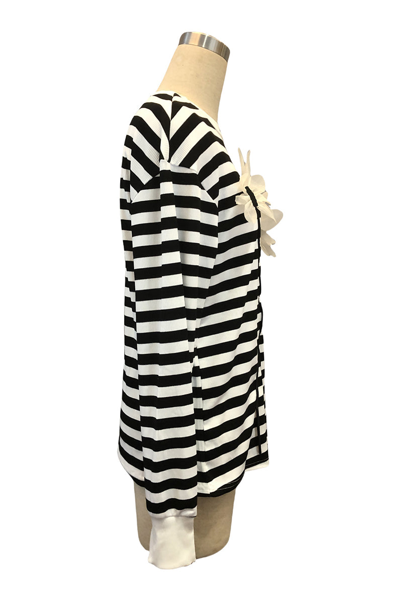 Your new statement t-shirt features chic stripes and unique floral appliques. Perfectly versatile for casual outings or a stylish day at home.