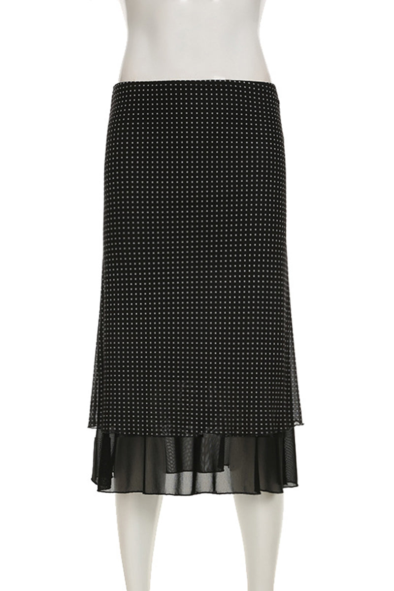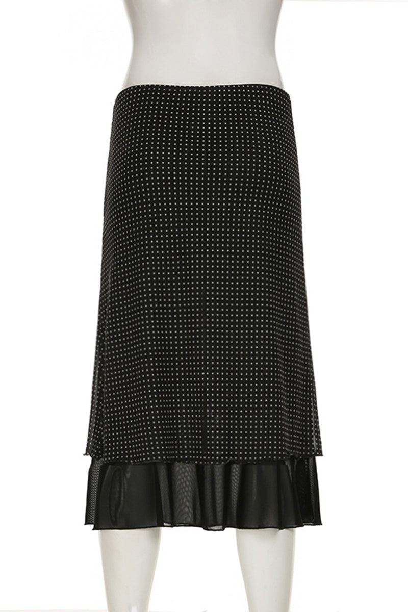 Your new skirt features a chic polka dot design with a flowing hemline. Effortlessly elevates your style for any occasion, day or night.