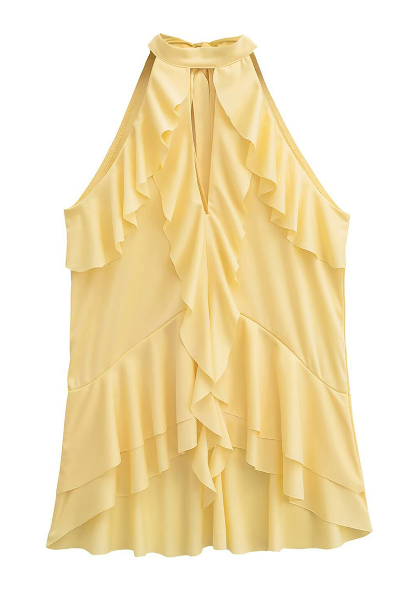 Your new staple tank top boasts a chic halter design with a tie-back detail. Perfectly versatile for layering or wearing solo on various occasions.