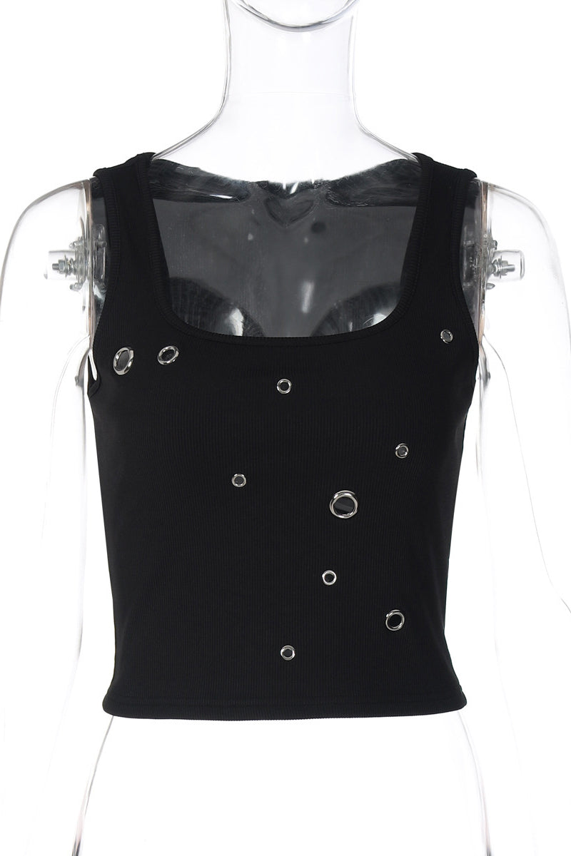 Your new statement tank features edgy eyelet embellishments. Perfectly suited for both casual outings and evening events.