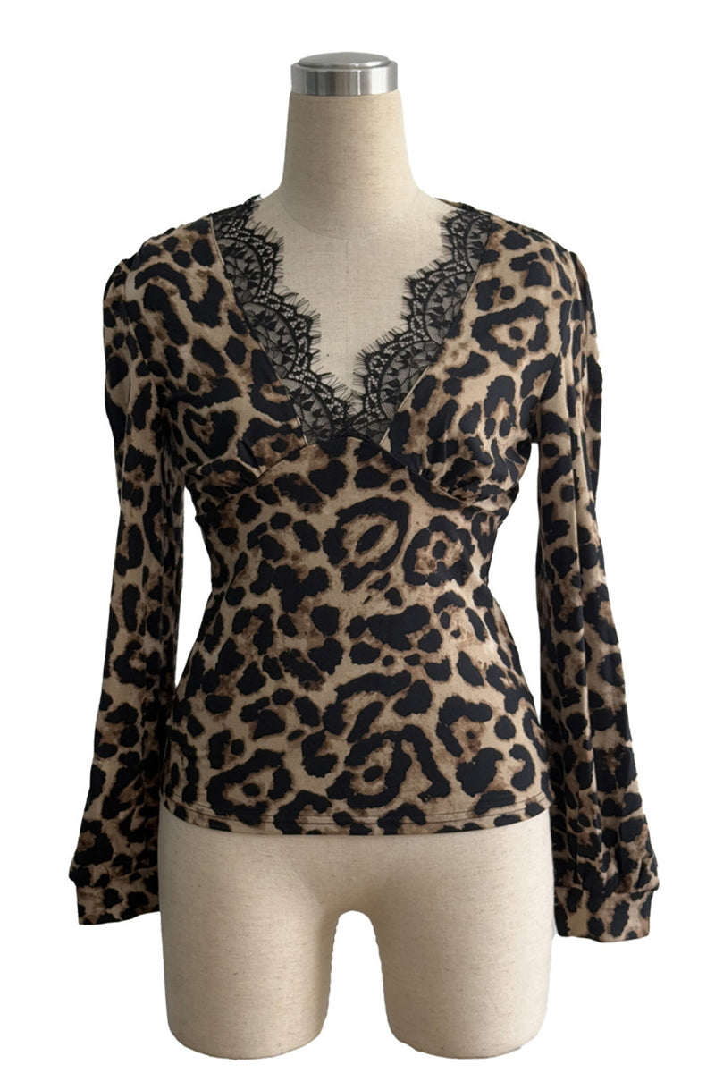 Your new favorite top features an eye-catching leopard print and elegant lace trim along the neckline. Perfectly pairing with a variety of bottoms for a chic day or night look.