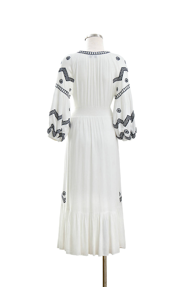 Your new favorite dress features intricate pattern and a breezy fit. Perfectly suited for casual outings and beachside strolls.