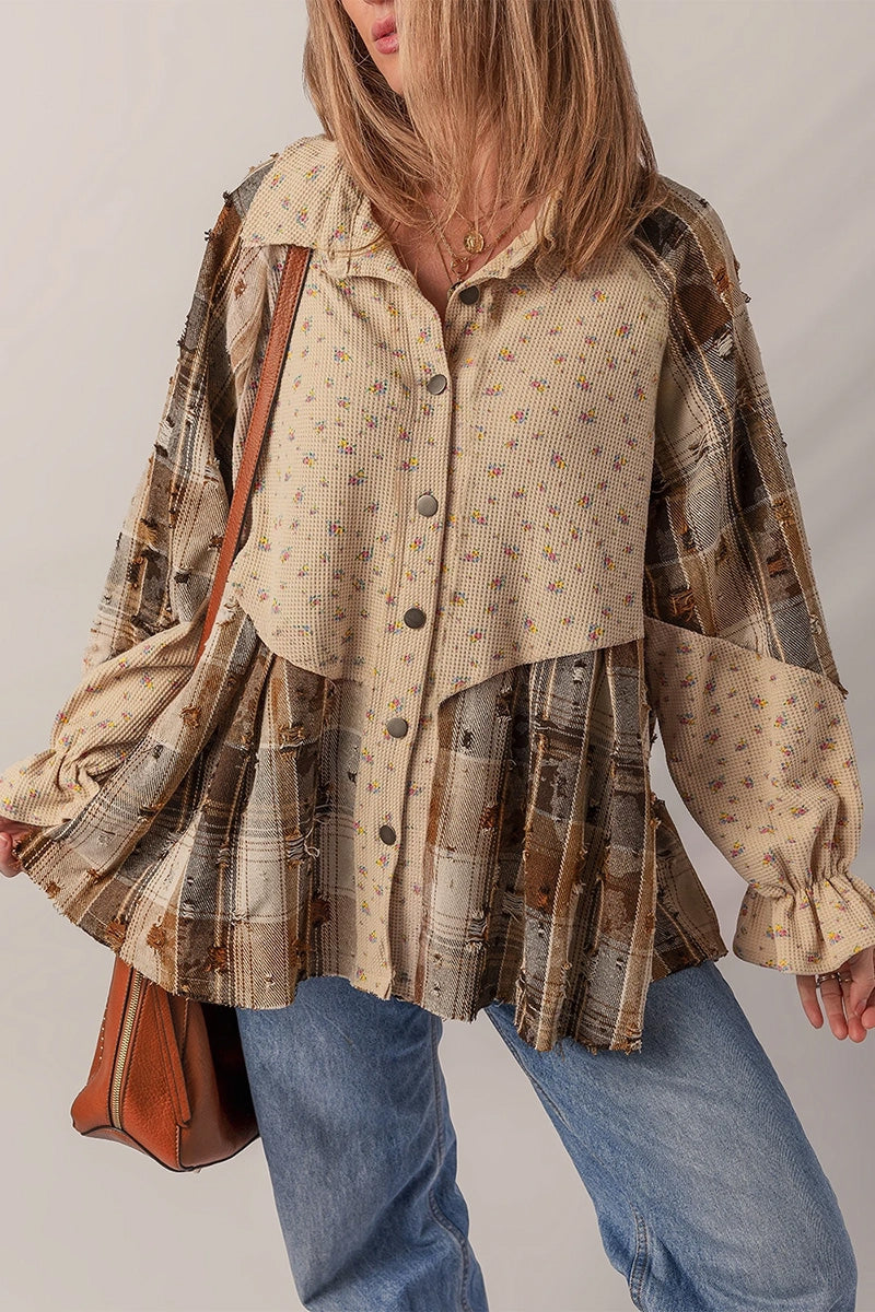 Your new boho-inspired shacket combines floral and plaid patchwork with charming ruffled sleeves. Adds a playful and relaxed vibe to your casual wardrobe.
