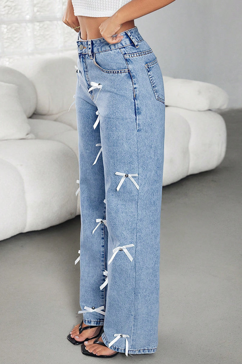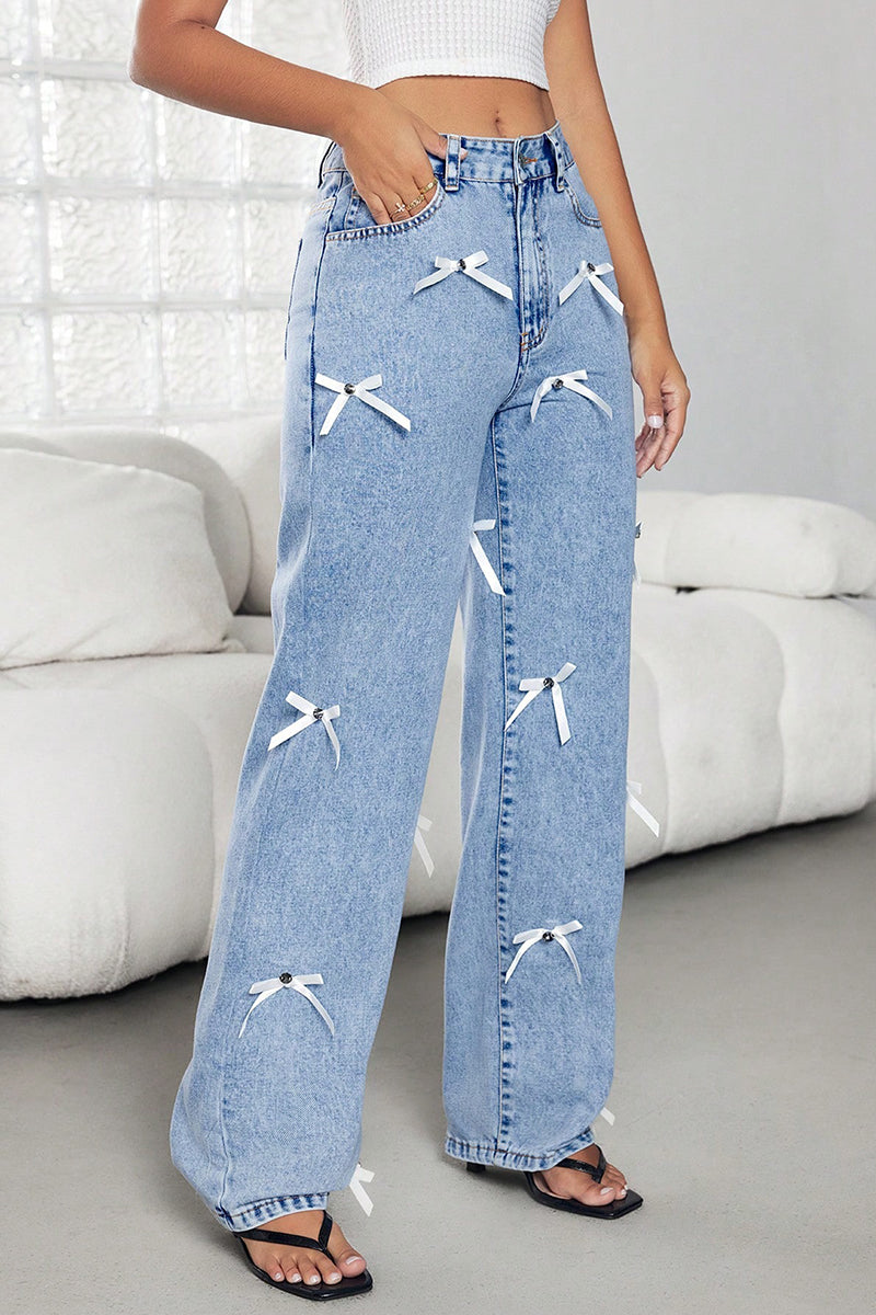 Your new statement jeans feature charming bow accents and a trendy straight-leg fit. Effortlessly pairs with any top, perfect for adding flair to your everyday wardrobe.