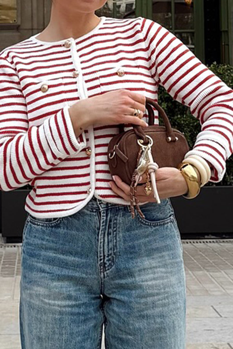 Your new essential cardigan boasts a classic button-front style and refined stripe pattern. Effortlessly complements any outfit, perfect for diverse settings.