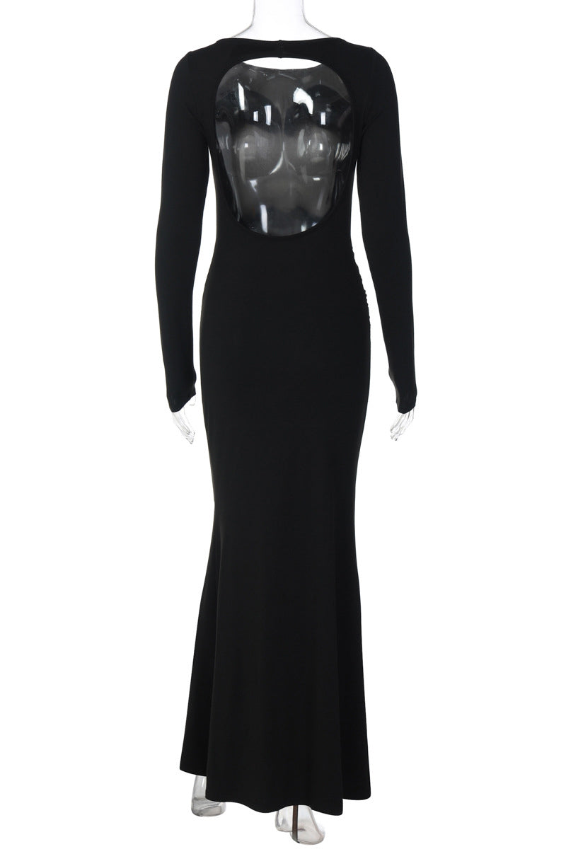 Your new dress features an elegant long sleeve design with a chic open back. Perfect for formal events or making a stylish statement at any occasion.