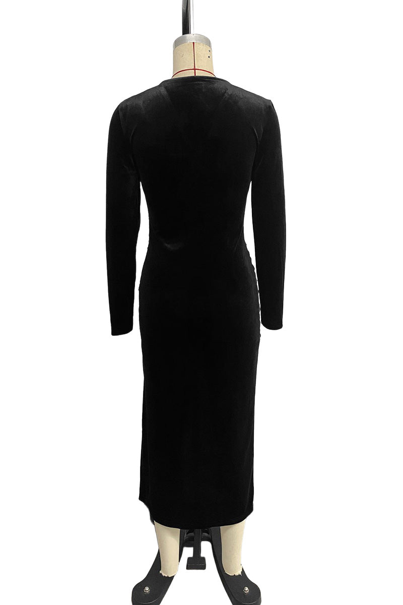 Your new evening essential features a sophisticated ruched design and a striking slit skirt. Perfectly crafted to elevate your style for any special occasion.