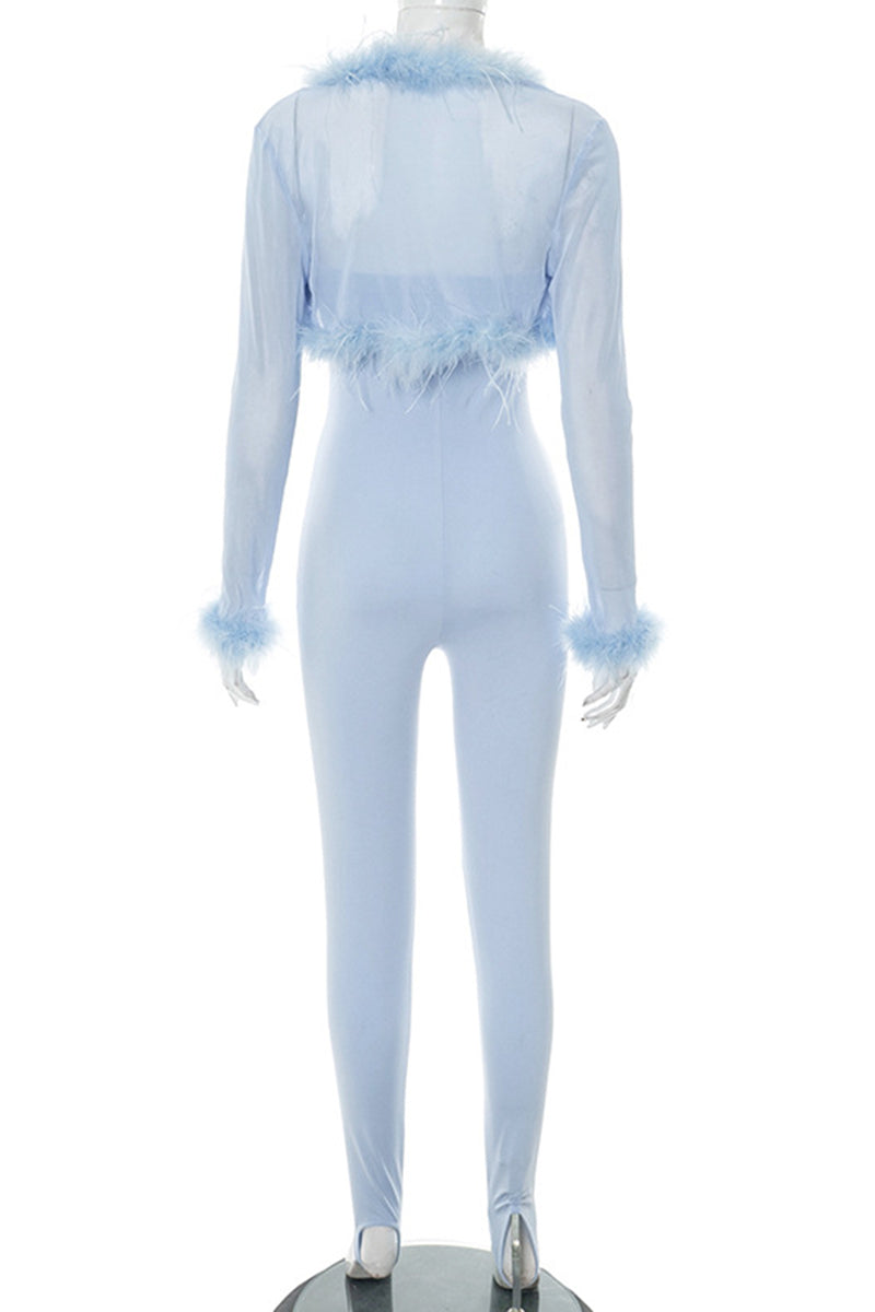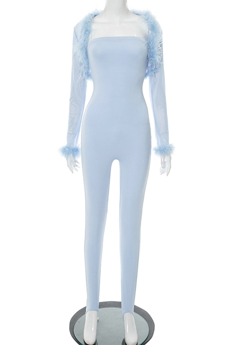Your new jumpsuit pairs feather accents with an off-shoulder neckline. A chic choice for evening occasions.