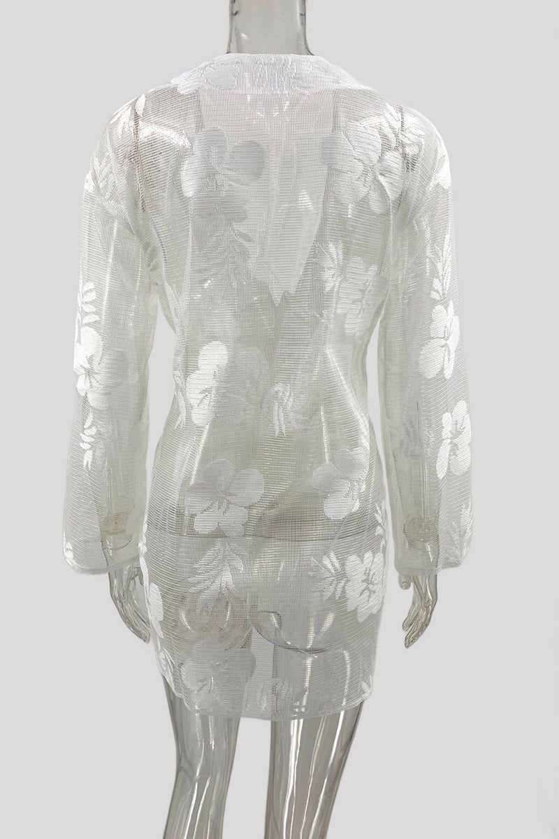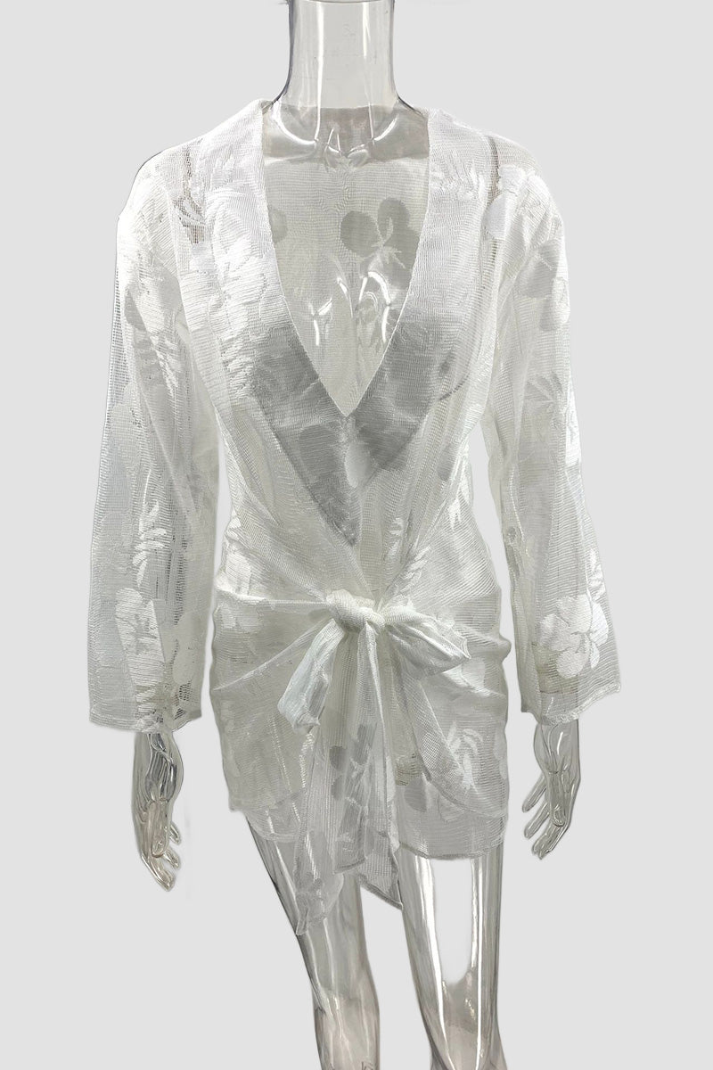 Elegant wrap romper with sheer floral lace and tie waist. Long sleeves add a touch of coverage while keeping it breathable. Perfect for beach dinners or evening strolls.