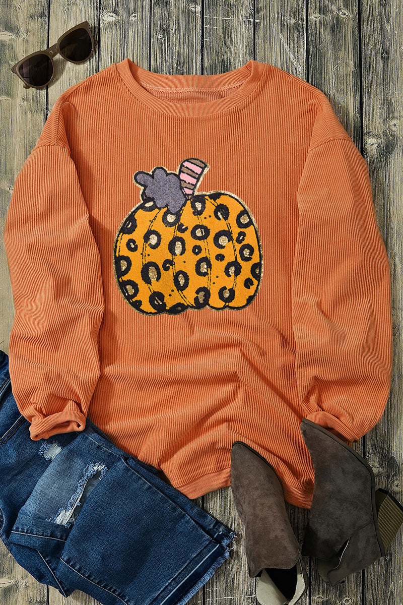 Your new festive pullover features leopard and pumpkin patchwork with ribbed detailing. Perfect for Halloween events and cozy seasonal style.