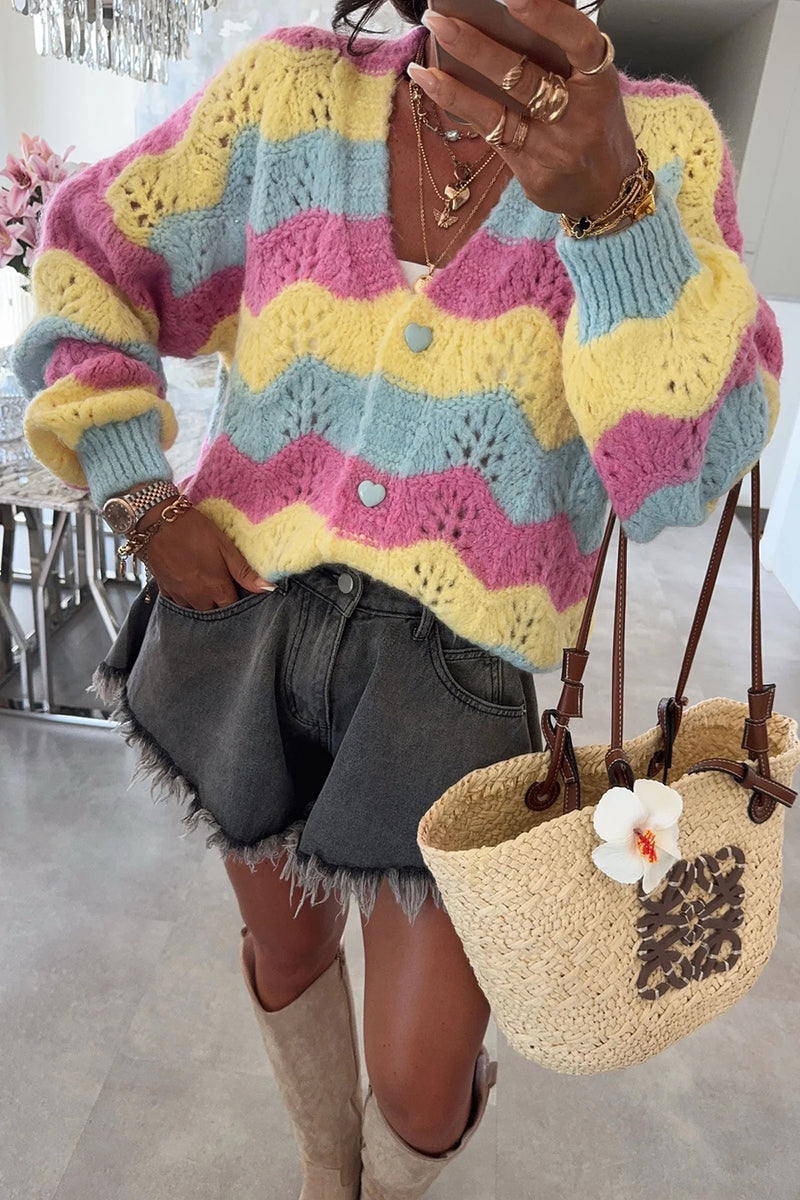 Your new wardrobe staple features a charming heart button detail and playful striped pattern. Perfect for layering, this cardigan effortlessly enhances both casual and dressy outfits.