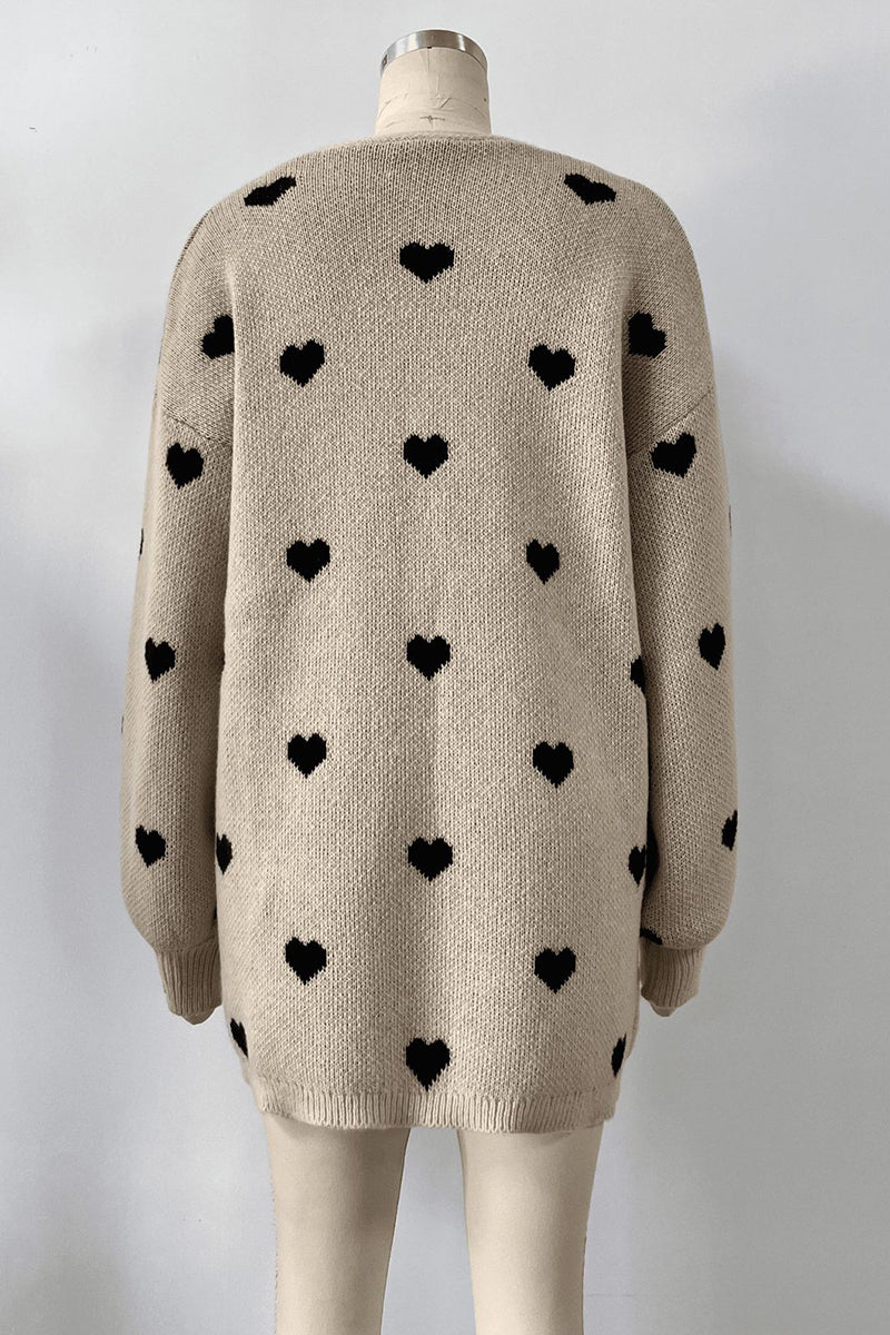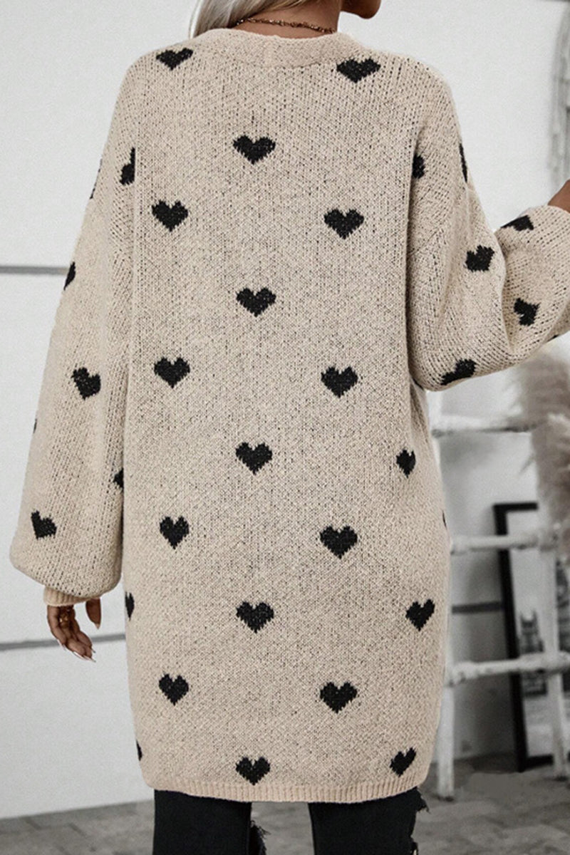 Your new favorite cardigan features a charming heart pattern and relaxed longline fit. Perfect for layering over any outfit, offering a stylish touch for daytime or evening wear.