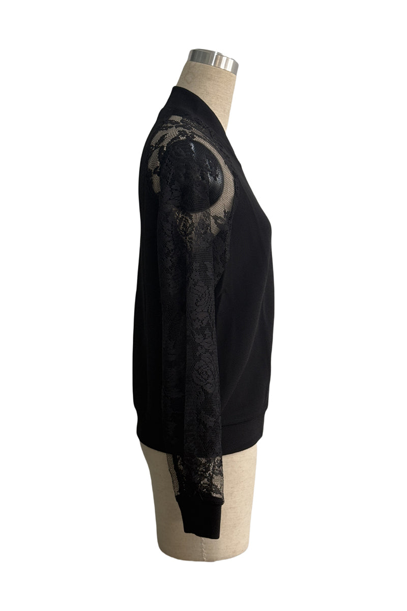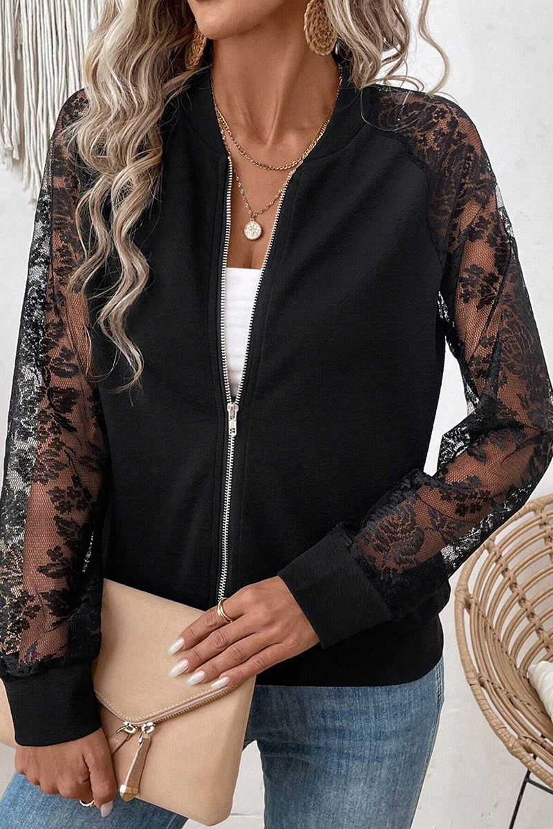 Your new go-to jacket features delicate lace accents and a versatile zip-up design. Effortlessly elevates any ensemble, making it ideal for various occasions.