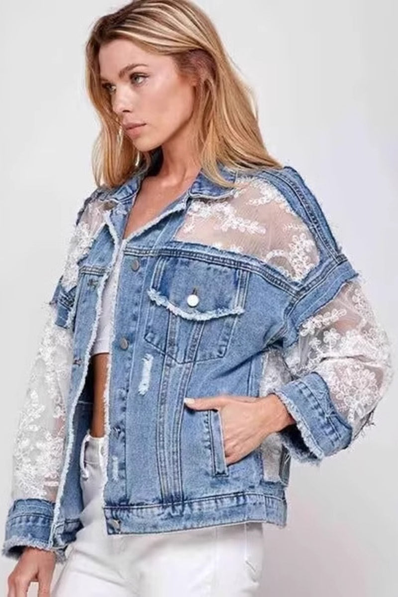 Your new go-to jacket features delicate lace sleeves and timeless denim style. Perfect for layering over any outfit, adding a touch of elegance to your wardrobe.