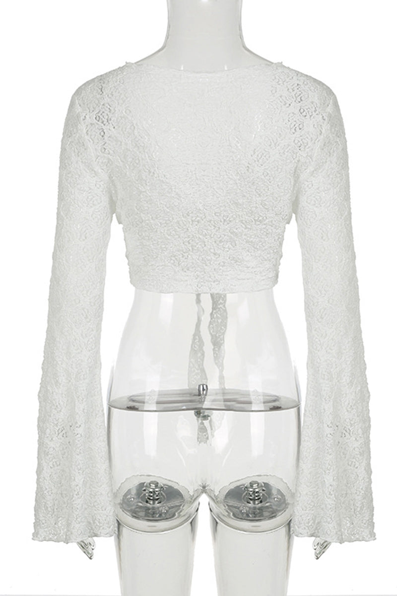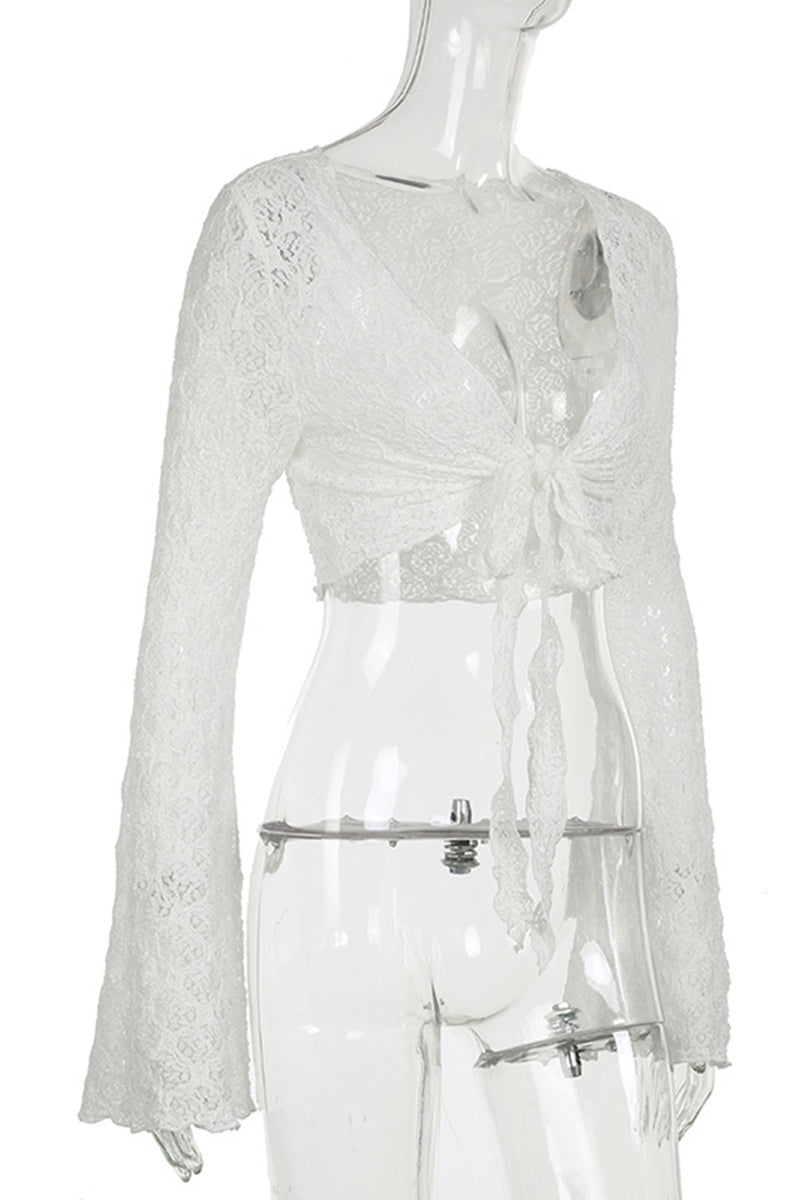 Your new favorite piece is a lace cover-up with bell sleeves, tie-front closure, and a sleek silhouette. The perfect layer for sun-soaked afternoons.