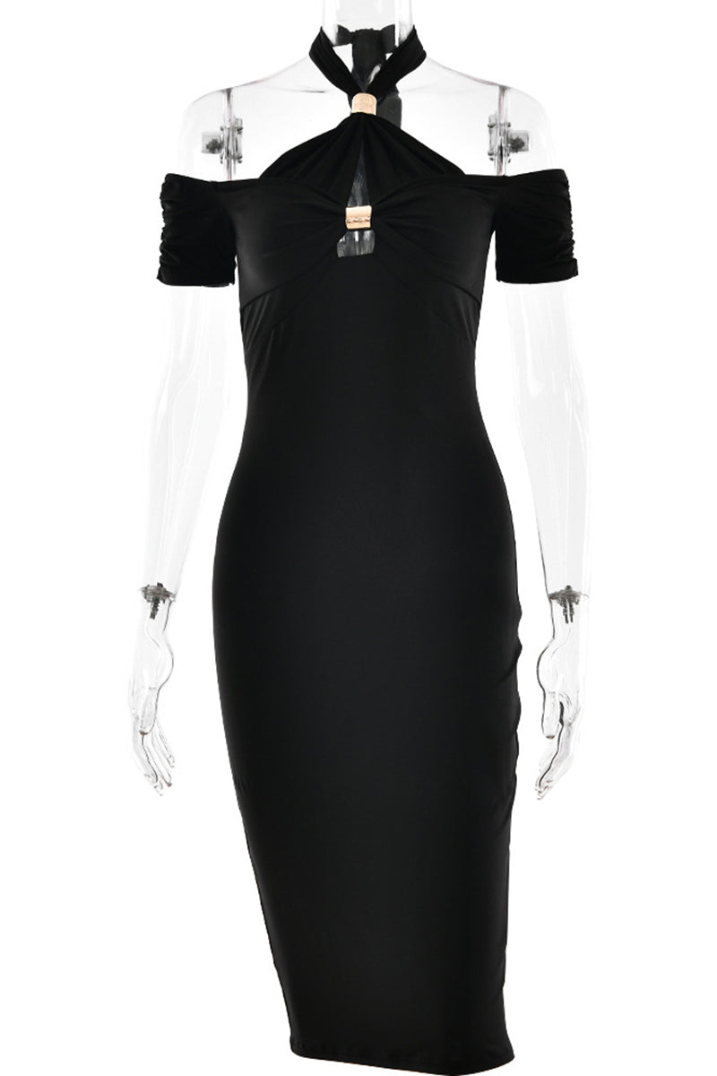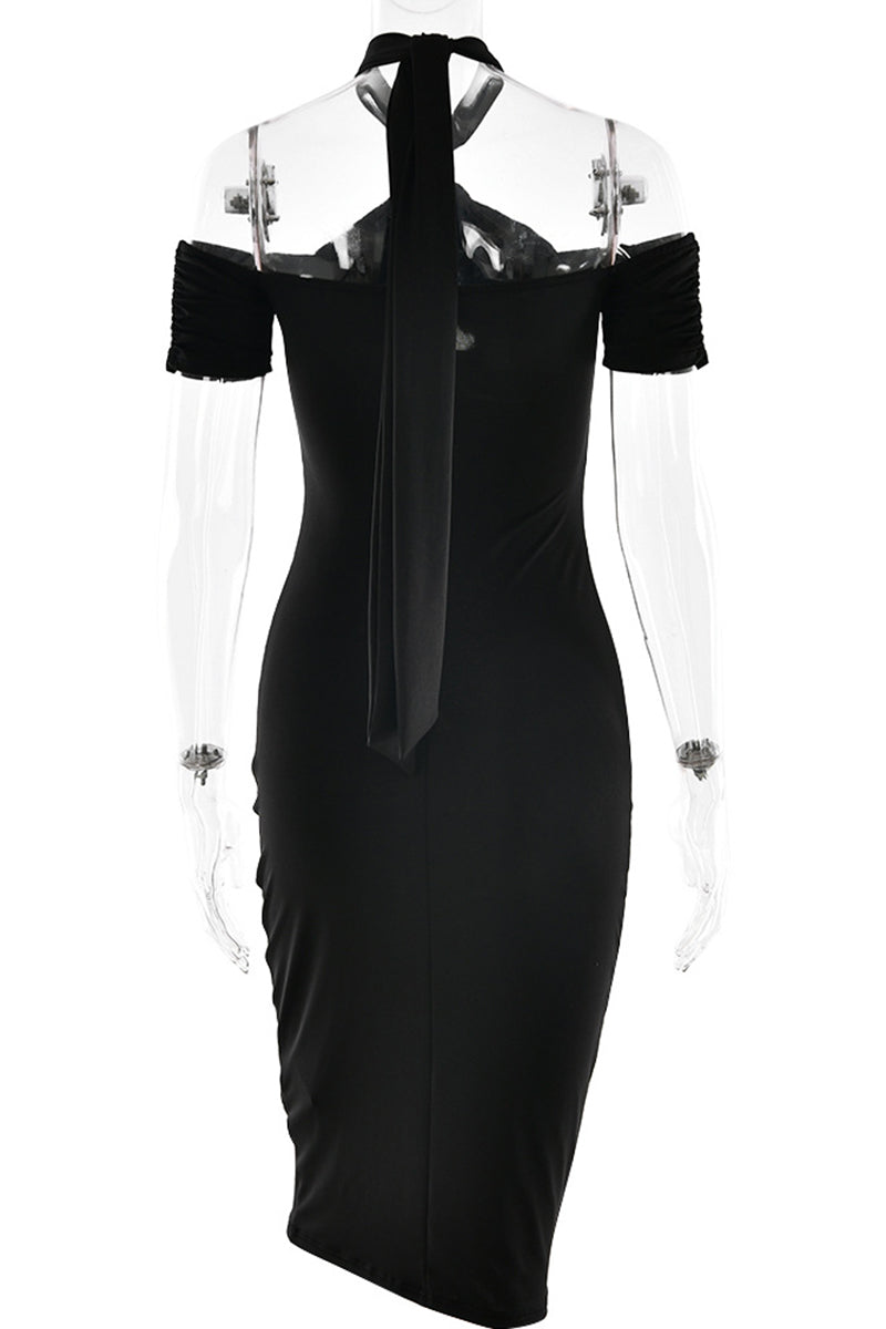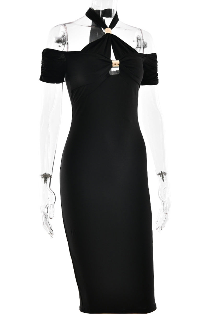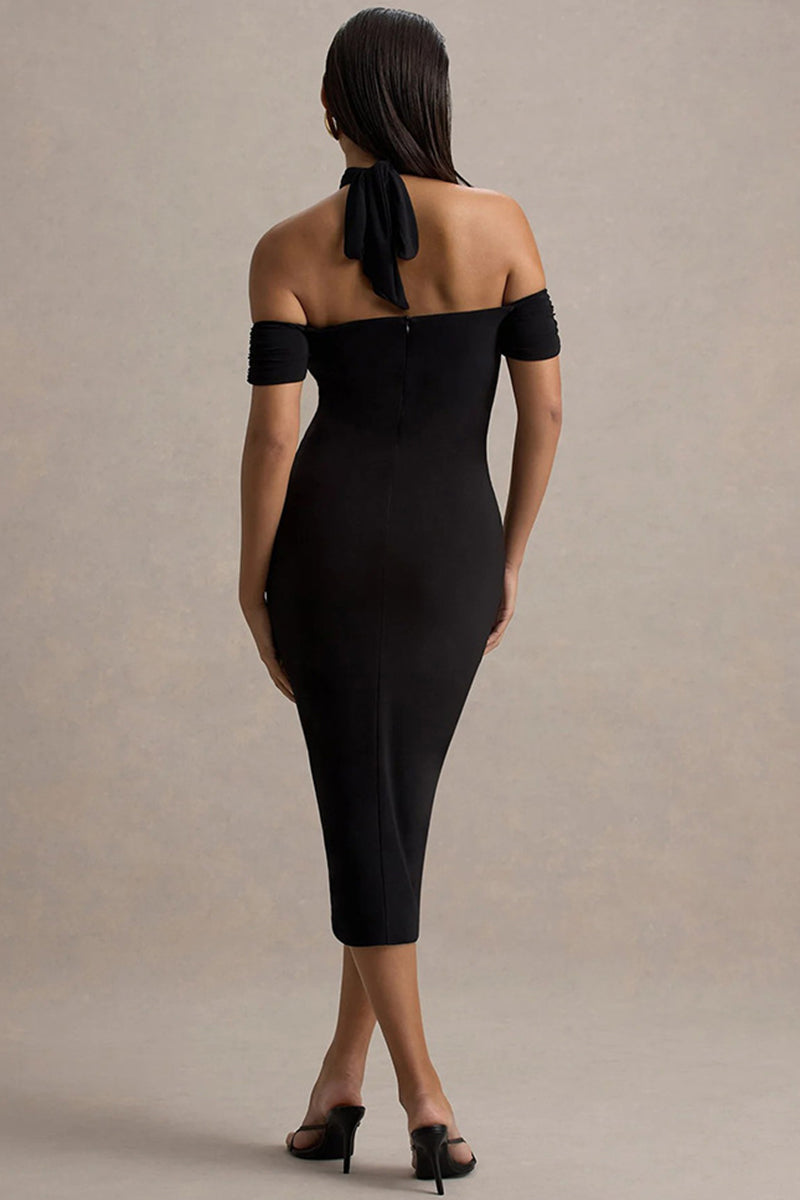 Your new bodycon dress includes a halter neckline and gathered off-shoulder details. Designed for a sleek, flattering fit.
