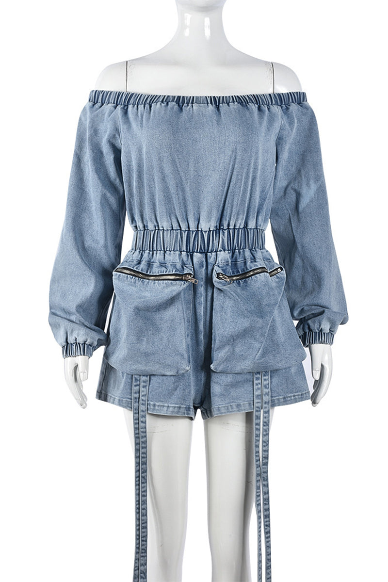 Off-Shoulder Denim Romper with Zipper Pockets