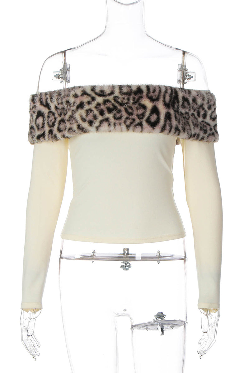 - Off-Shoulder Faux Fur Trim T-Shirt