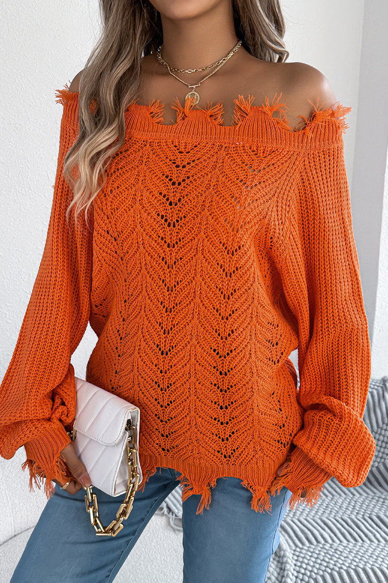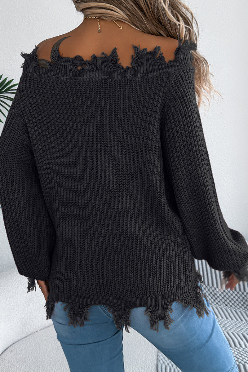 Your new sweater features a chic off-shoulder design with frayed details. Perfect for casual outings, it seamlessly combines comfort and style.