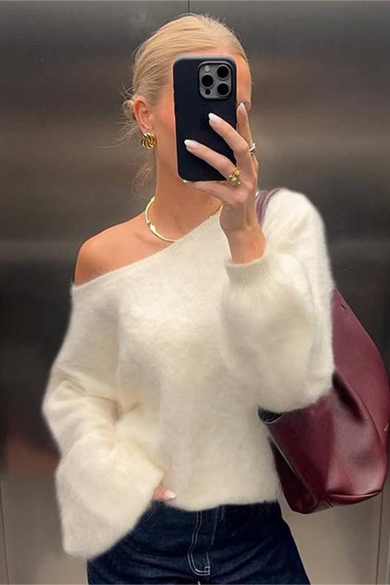 Your new go-to sweater boasts an off-shoulder design and cozy texture. Perfectly transitions from casual to chic, suitable for a variety of settings.