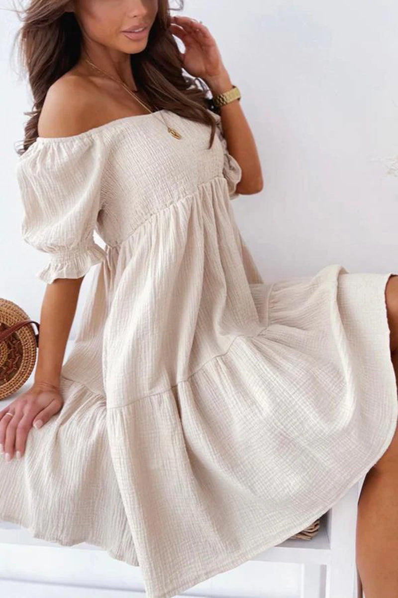 Your new favorite dress offers a charming off-shoulder style with a relaxed fit. Perfectly suited for casual outings, this dress is both chic and comfortable.