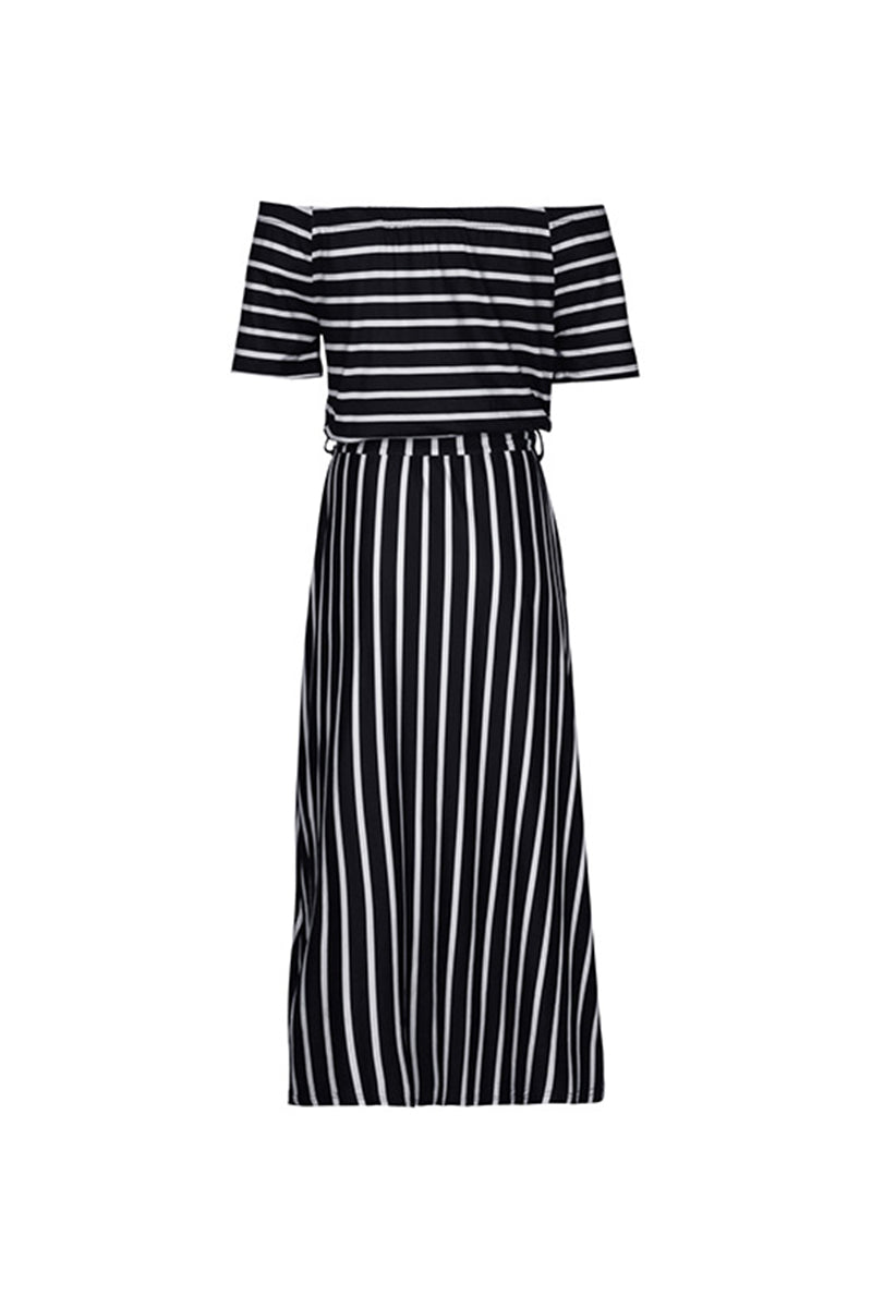 Your new favorite dress showcases an off-shoulder design with chic stripes. Seamlessly transitions from casual daywear to stylish evening attire.