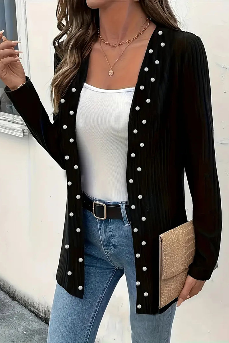 Your new go-to outerwear piece is highlighted by elegant pearl detailing. Perfect for dressing up casual looks and effortlessly transitioning from day to night.