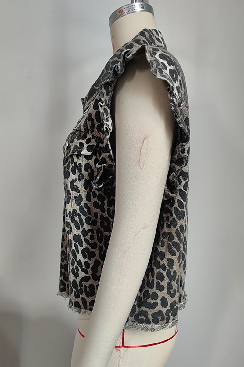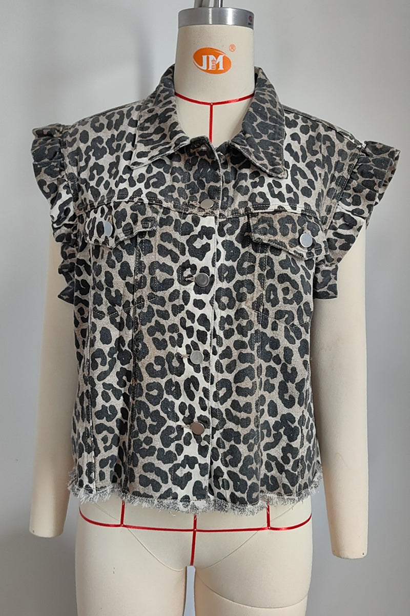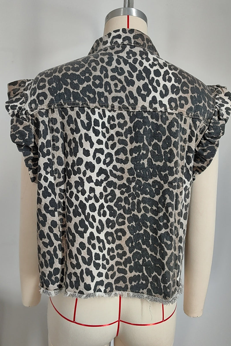 Your new favorite denim jacket features a chic sleeveless design with stylish ruffle details. Perfect for layering and adding a fashionable touch to any casual or dressy look.
