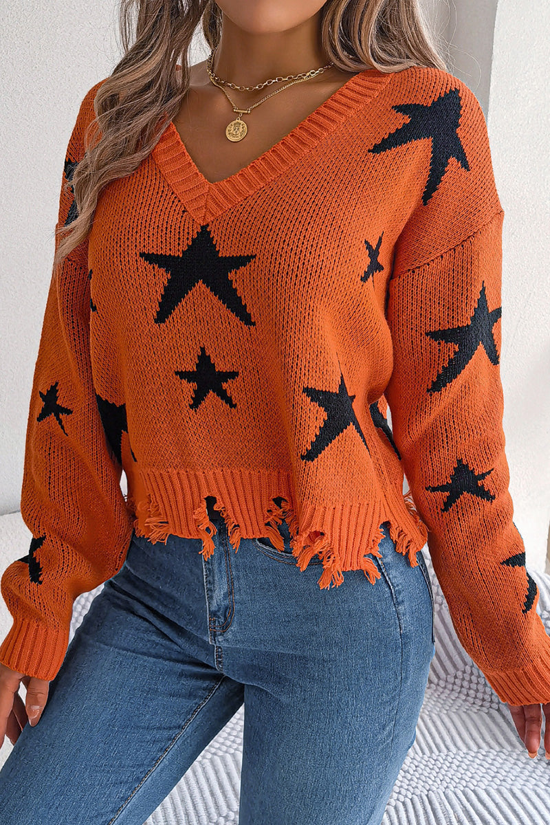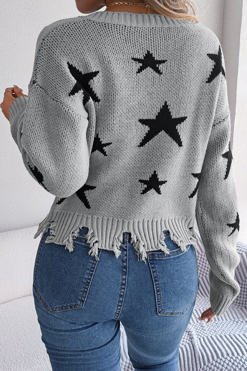 Star-Patterned Distressed Hem Sweater