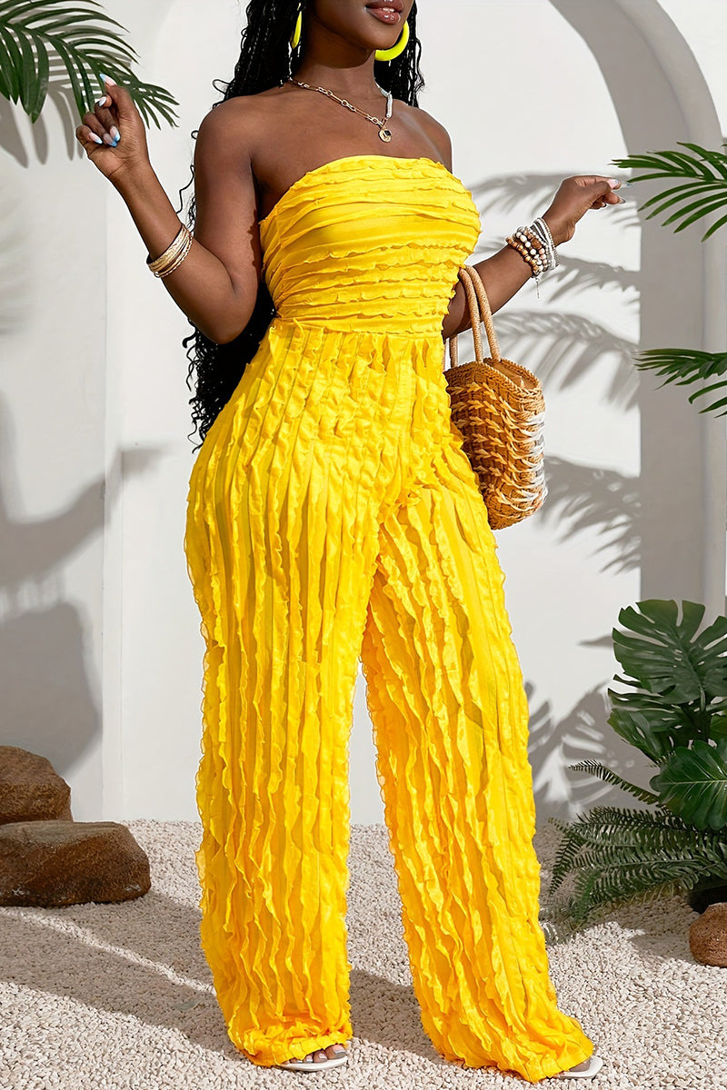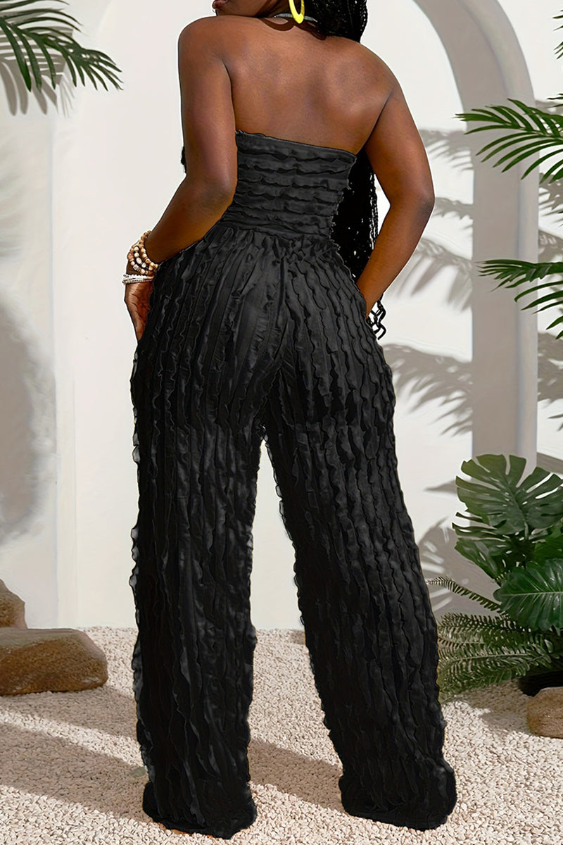 Your new jumpsuit showcases layered ruffle details with a relaxed strapless fit. Perfect for effortless chic day-to-night styling.