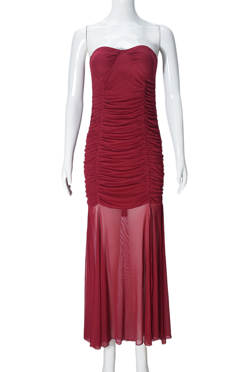Your new captivating evening look features a chic strapless and ruched design. Perfect for making a statement at any formal event.