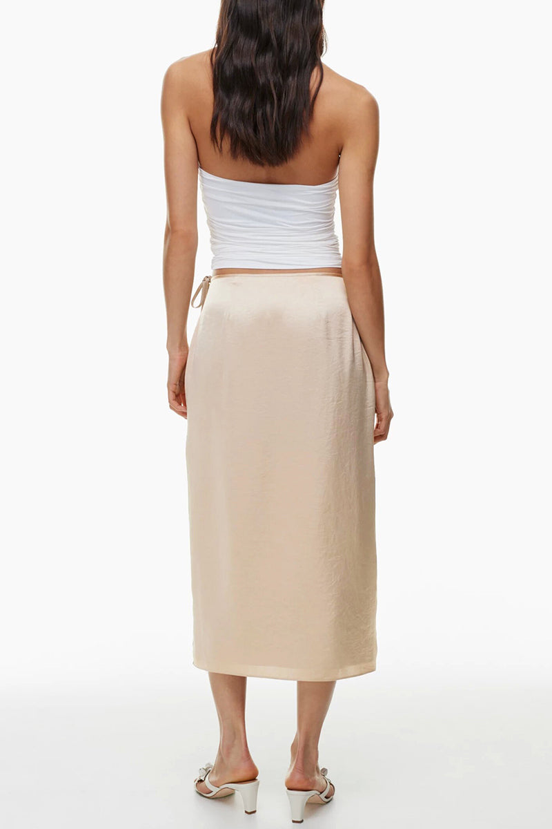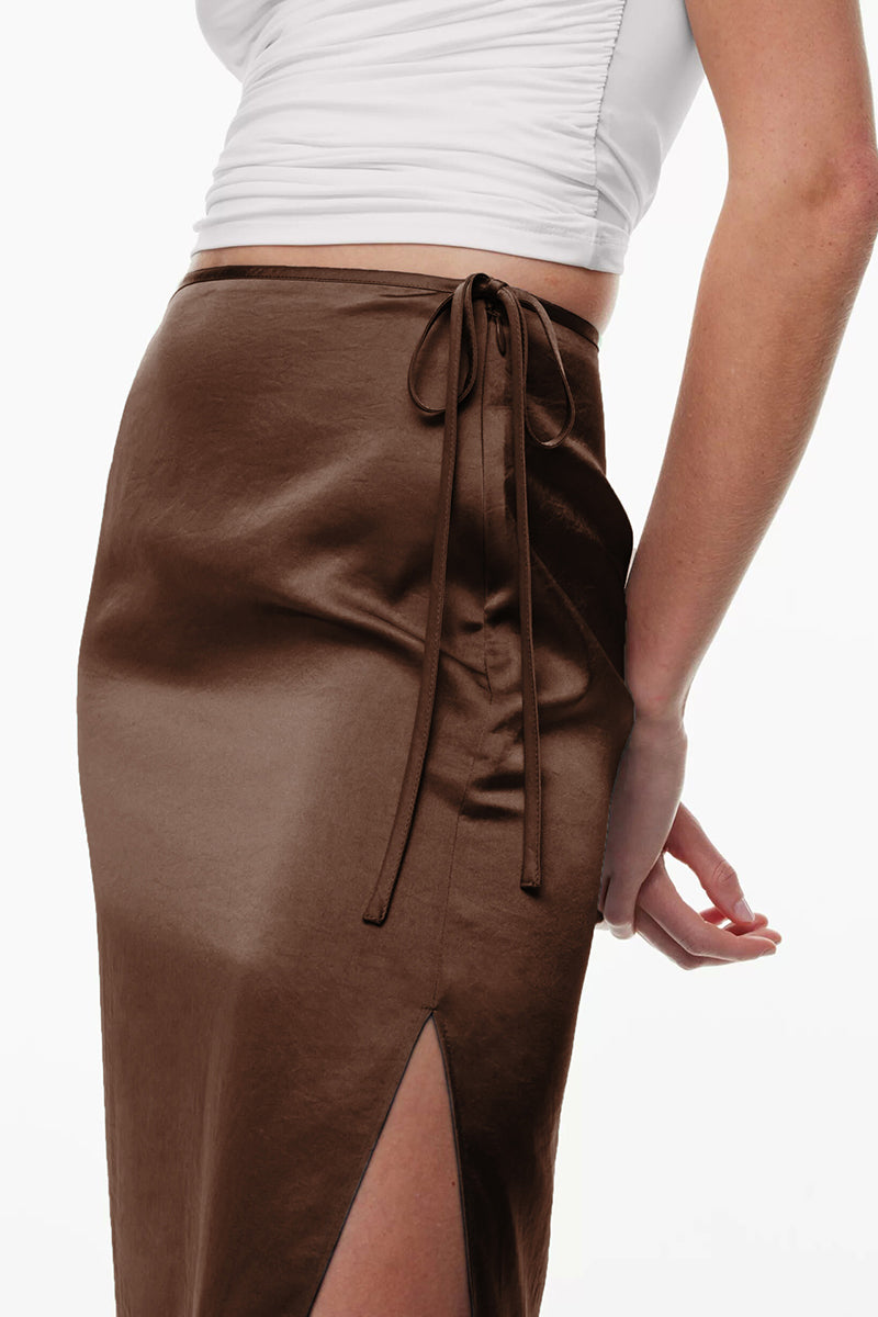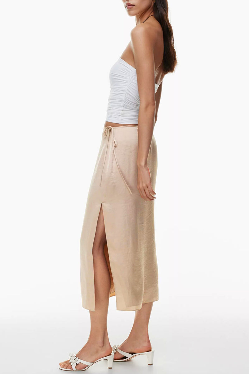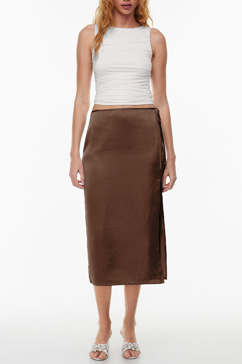 Your new midi skirt features a chic wrap-tie design for a personalized fit. Perfect for adding elegance to everyday looks and evening outings.